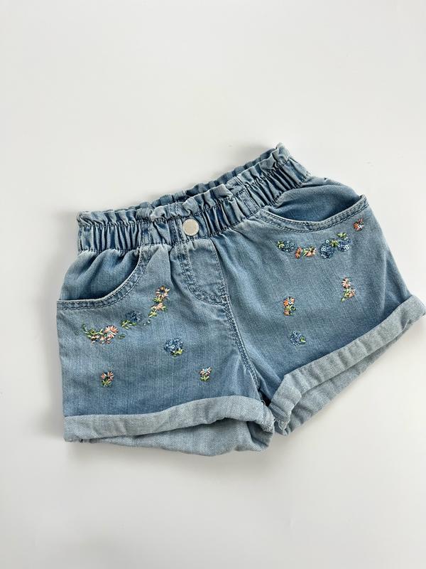 Дитячі джинсові шорти від британського бренду Next для малюків 1,5-2 роки. Особливості: • Розмір: 92 (1,5-2 роки) • Матеріал: 100% бавовна • Колір: блакитний • Декор: яскрава вишивка квітковими мотивами • Зручна гумка на поясі • Підвернуті манжети • Функціональні кишені • Стан: 9/10 - відмінний стан М'які та зручні шорти з натуральної бавовни забезпечують комфорт під час активних ігор. Квіткова вишивка додає святковості повсякденному образу.