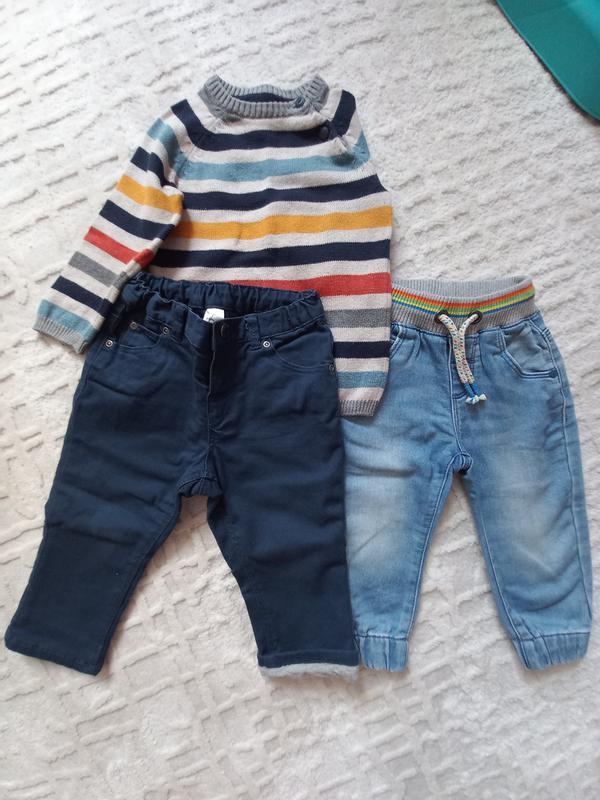 детские вещи в новом состоянии, одеты несколько раз. Джинсы светлые итальянской фирмы Blukids, на 12-18 мес., джинсы h&m возраст 9-12 мес., утепленные, но крупноконечные и по размеру идут как на 12-18 мес., свитер h&m, 9-12 мес по наборке, но по факту до 2-х р. За все цена 450 грн.