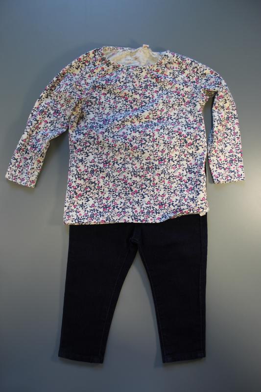 Лонгслив с длинным рукавом от бренда name it. ЗАМІРИ: Рукав к горловине 33 см Длина кофты 35 см Воротничок на резинке Джинси H&M Талия на резинке Есть пуговица для регулировки Спереди кармашки декоративные. ЗАМІРИ: Талия 23 см Длина 44 см Обе вещи в отличном состоянии.