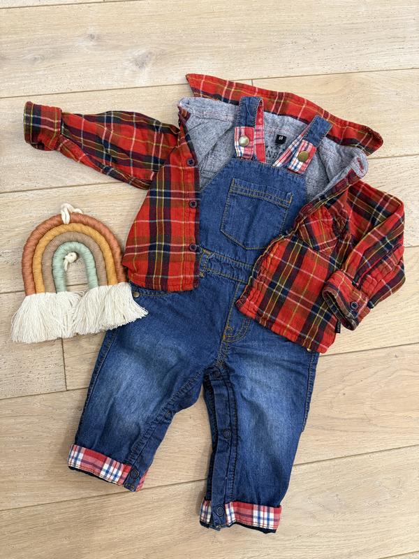 Стильний комплект для хлопчика - джинсовий комбінезон і рубашка в клітинку. Комбінезон має кнопочки між ніжками для легкої заміни підгузку.