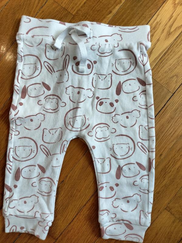 Новенькие трикотажные штанишки на малышке от 6-9мисе. Длина с поясом до низа штанины 34см, длина с поясом до памперса 18см, талия 20см.