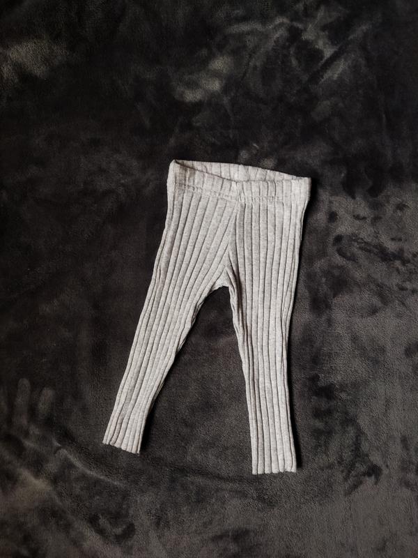 Лосины в рубчик серого цвета, в идеальном состоянии. Размер указан 74, но одевали уже в 2 месяца, брюки длинные, резинка заузкая как для 6 мес, но зависит от ребенка.