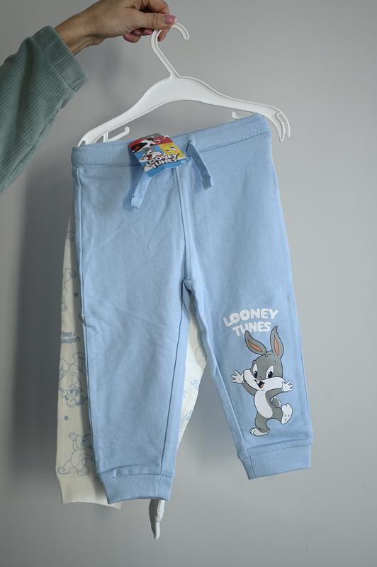 Дитячі штани Looney Tunes Милі та зручні дитячі штани для малюків з улюбленими персонажами Looney Tunes. У комплекті дві пари: одна — блакитного кольору з яскравим принтом зайчика Багза Банні, друга — світла з ніжним повторюваним малюнком. Штани виготовлені з м’якого та приємного до тіла трикотажу, добре підходять для щоденного носіння, прогулянок і дому. Еластичний пояс зі шнурком забезпечує комфортну посадку, а манжети внизу не дають штанинам задиратися. Характеристики: • Матеріал: бавовняний трикотаж • Посадка: зручна, не сковує рухів • Пояс: еластичний зі шнурком • Дизайн: Looney Tunes (Багз Банні) • Підійдуть для дому, садочка та прогулянок