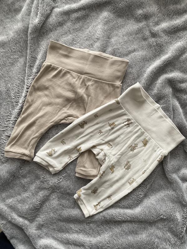 Дитячі бавовняні штанці від H&M. В комплекті 2 шт. Розмір 56 см ( 0-2 міс). Дефектів немає. Матеріал: 100% бавовна