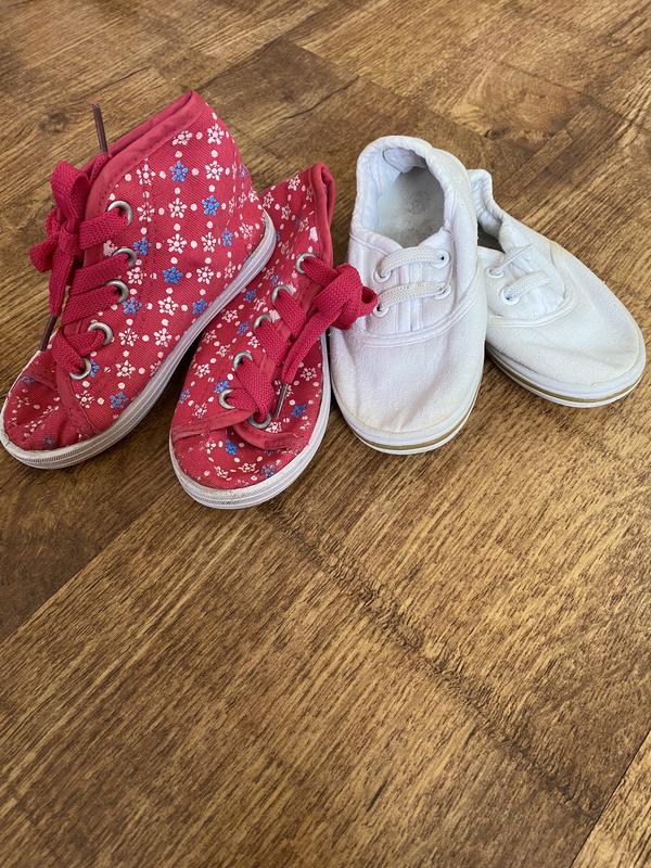 2 пари за 50 грн Белые тапочки- английский бренд Slazenger, натуральный текстиль в размере 21,5 (длина стельки 13,8 см), прорезиненная шнуровка. Супер легкие и удобные. Розовые тапки- текстильные, удобные в размере 21