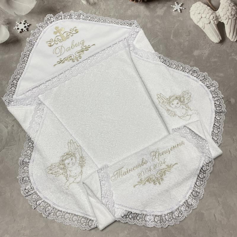 Крыжма "Руслан" – Изысканная Качество и Полная Индивидуализация Сделайте день Крещения вашего ребенка по-настоящему особенным с крыжмой "Руслан". Эта модель сочетает практичность, традиционную красоту и уникальное предложение. Ключевые преимущества модели "Руслан": Практичный Размер 90х90 см: Оптимальный размер, который идеально подходит для новорожденных и младенцев, обеспечивая удобное и теплое завертывание после купели. Натуральная Ткань (Махра): Изготовлена из мягкой, гипоаллергенной махры (состав 100% хлопок), что обеспечивает быстрое поглощение влаги и нежное согревание чувствительной кожи малыша. Премиум Отделка: Края поля декорированы изысканным и широким кружевом-вышивкой на сетке. Это придает изделию объем, роскошь и праздничный вид. УСЯ ВИШИВКА У ВАРТОСТІ! (Именное): Уникальное предложение – вся машинная вышивка (включая крестик, имя ребенка и дату крещения) ВЖЕ ВКЛЮЧЕНА В ЦЕНУ ТОВАРА. Вам не нужно доплачивать за создание уникальной реликвии. Мы предлагаем широкий выбор шрифтов и цветов нитей (например, золото, серебро, голубой, белый). Идеально на Подарок: Благодаря полной индивидуализации, "Руслан" является готовым, трогательным и очень ценным подарком от крестных родителей или родственников. Крыжма "Руслан" – это тепло, красота и имя вашего ребенка, навсегда зафиксированные в светлом ритуале.