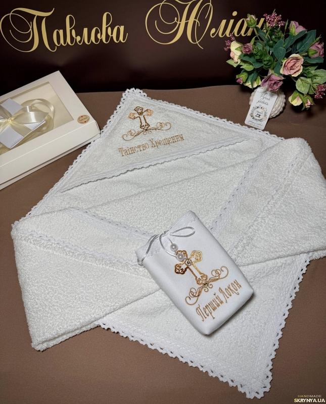 Крижма ′Благодать′ Выполнена из натуральных материалов, украшена ажурным кружевом и изящной вышивкой. Пришивные украшения добавляют особый шарм (не боятся воды и со временем не темнеют). Уголок опрятно закрытый - изнанка вышивки незаметен. Размер льды : 90×90 см (по диагонали 127 см). По желанию можно приобрести мешочек для первого локона: 18×14×4 см. Крыжма имеет подарочную коробку. Код изделия: 216 Внимание! Цена указана за крыжму, если надо мешочек 350 грн