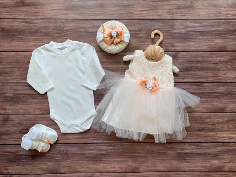 Подарочный набор для маленькой принцессы. Возраст ~ 0-3 месяца. Боди (cotton 100%): длина 33см/ПО груди 20см/рукав 21см Платье (атлас+фатин): длина 36см/ПО груди 23см Пинетки: 11см Повязка: ПО головы 13-17см