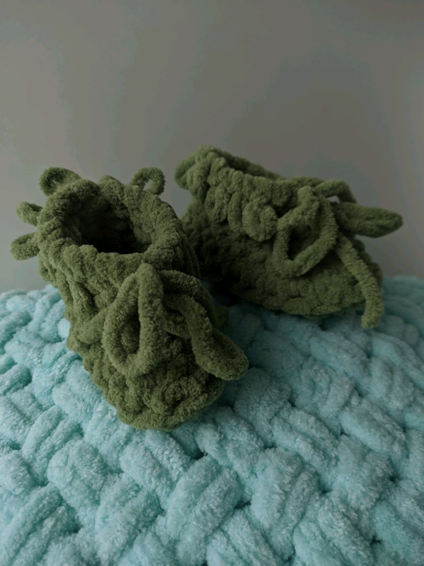 Тип одягу: Пінетки М'які та затишні пінетки ручної роботи. Зв'язані із турецкої пряжі alize puffy fine. Довжина підошви - 12 см. Підійдуть на виписку, для фотосесії або повсякденного використання.