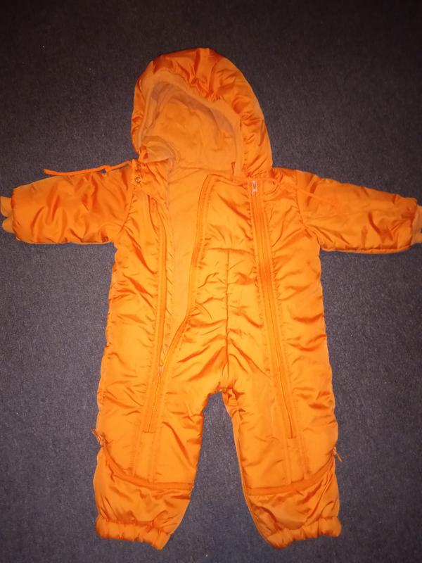 Комбинезон от 0 до 12 месяцев. Есть две продольные застёжки спереди, молнии снизу, всё рабочие, укорачивается длина. Длина комбеза от 50 до 60 см, длина рукава 20-22см. Состав на 6 фото.