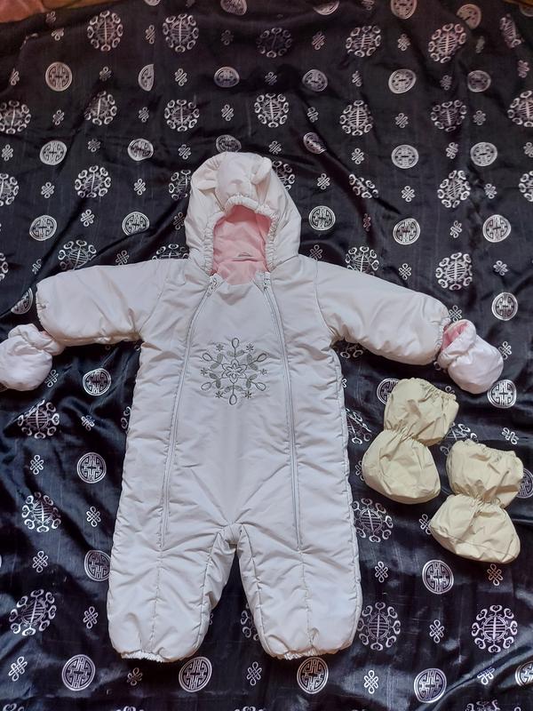 Дитячий комбінезон Єврозима у хорошому стані. Носили всю зиму, дуже теплий) Є невеликий дефект (на фото 2 пару мало помітних точок на спинці) практично не помітний. На зріст 80 см. Пінетки купувала окремо, їх віддаю у подарунок. Пінетки на ніжку до 13 см.