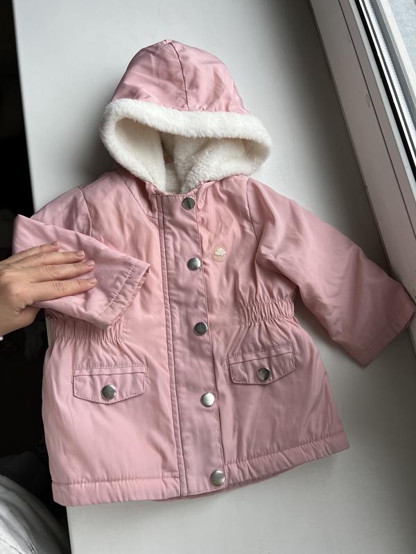 Парка демісезонна, не на сильні холода. Підкладка плюшева. Розмір вказаний 6-9 місяців, ми носили до 12 місяців. Дуже красива, ніжна виблискуюча. Залишились нею дуже задоволені. Стан як нова.
