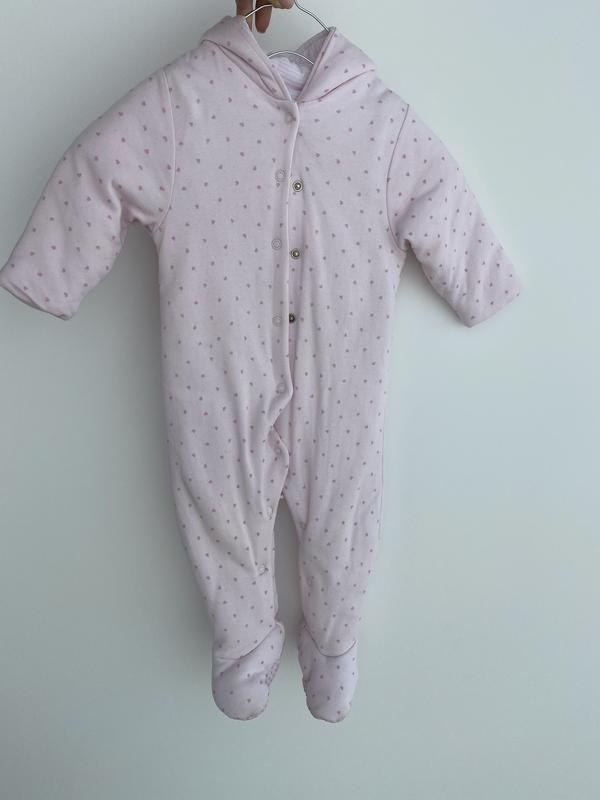 Комбинезон двухсторонний, одна сторона в полоску, другая сторона в сердечко. Нежно-розового цвета, размер 9-12 мес. Одевали пару раз, после химчистки. Идеально на весну и осень, утеплённый.