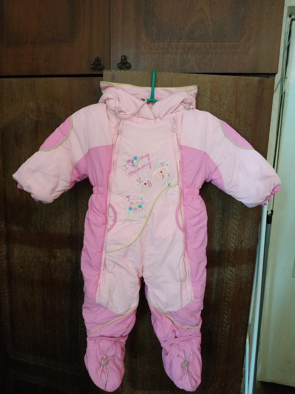 Детский комбинезон-трансформер на девочку. Сезон: осень-зима. Возраст: 0-6 месяцев Есть нюанс: маленькое пятнышко, видно на фото. Очень теплый и удобный, можно застегивать конвертиком или одевать, как комбинезон - в комплекте сапожки-пинетки и рукавички.