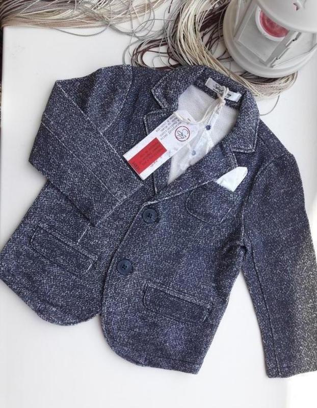 Супер стильный трикотажный пиджак .цвет сине-серый. .Одевался один раз на годик. Рост 80 см Возраст 9 - 12 мес Ткань Смешанный состав Отличное европейское качество Замеры изделия: ПОГ-29 см дл.рукава-27 см дл.изделия-33 см ширина плеч-22 см