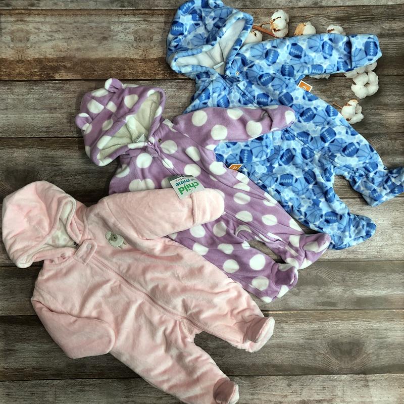 Остался синий. Плюшевые комбинезоны. Размер 0-3мес. Длина 50см. Рукав по внутреннему шву 19см. Розовый- Carter’s, синий и горох Heathtex.