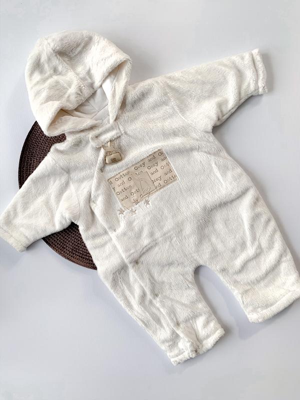 Тепленький комбінзон на хлопковій підкладці. На 0-3 міс {буде і на довше}. Ми одягали під низ зимового комбінзону {як варіант}. Також підійде на весну Колір: молочний Загальна довжина: 52 см Крок: 15 см Рукав: 19,5 см