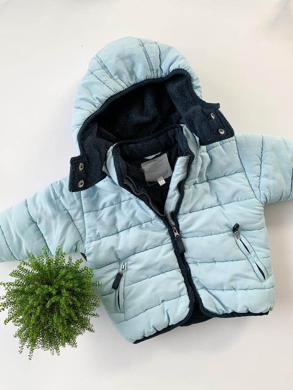 Курточка на холодну осінь - теплу зиму. Можливо і на холодну, на дотик вона товстіша ніж наш зимовий комбінзон😱На зріст 74 см, буде на довше Вона є без плям, зверху ідеальний стан. Тільки всередині, там де капішон, є фліс і на ньому появилися білі крапочки (на фото видно). При носці цього не помітно, оскільки капішон гарно прилягає