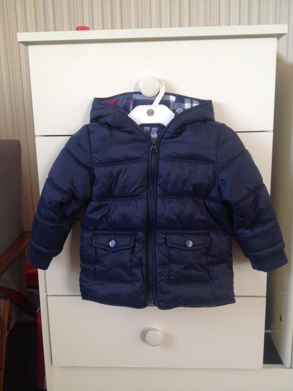 Практична куртка для малюка. Зверху - вітронепродувний матеріал. Всередині - бавовняна підкладка, в рукавах - поліестерова. Довжина по спинці 38.5, ширина 31, рукав від плеча 27 . Застібка - блискавка. З капюшоном. Наповнювач - синтепон. Склад: верхній матеріал, наповнювач і підкладка рукавів: 100% поліестер; основна підкладка 100% бавовна.