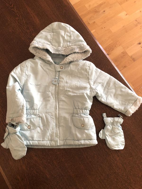 Демисезонная курточка. В комплект входят варежки, которые удобно пристёгиваются к курточке. Состояние идеальное. Красивого бледно голубого цвета.