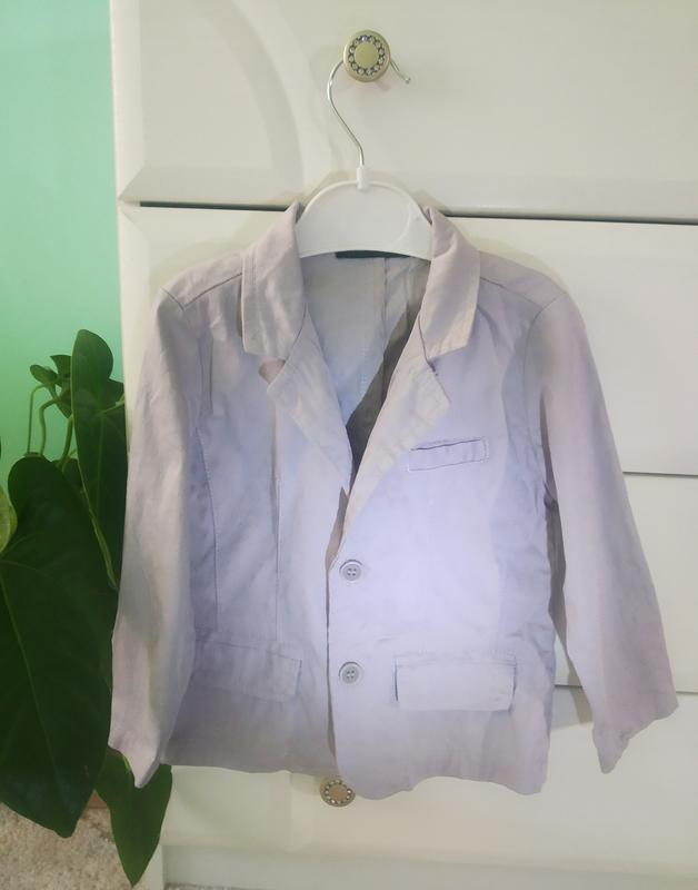 Стильный удобный пиджак для маленького модника. Не парит, приятный, из натуральной ткани (98%- Котон, 3%-еластан) Отличный вариант под брюки или джинсы. Цвет светло-серый. Подойдёт на 1,5-2.5 года. Замеры по запросу.