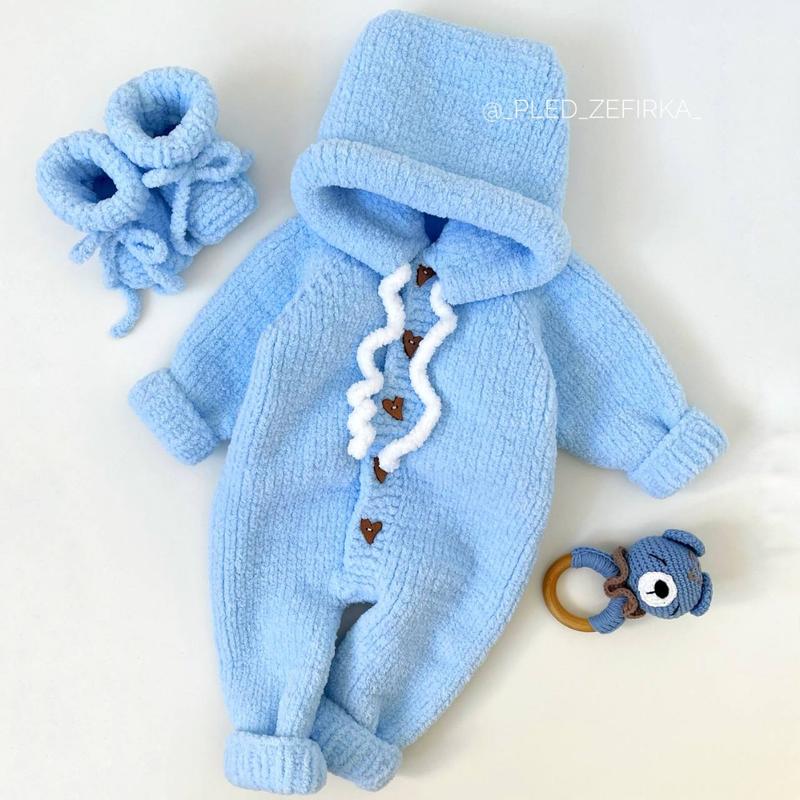 Плюшевый комбинезон ручной работы. Связан из гипоалергенной детской пряжи (100% микрополиэстер). Температурный режим +17-+22. В наличии цвета: мята, белый, коричневый, серый, белый, голубой (размер 0-3 мес), коричневый и белый (размер 3-6 мес). В другом цвете и размере под заказ, срок изготовления 7 дней.