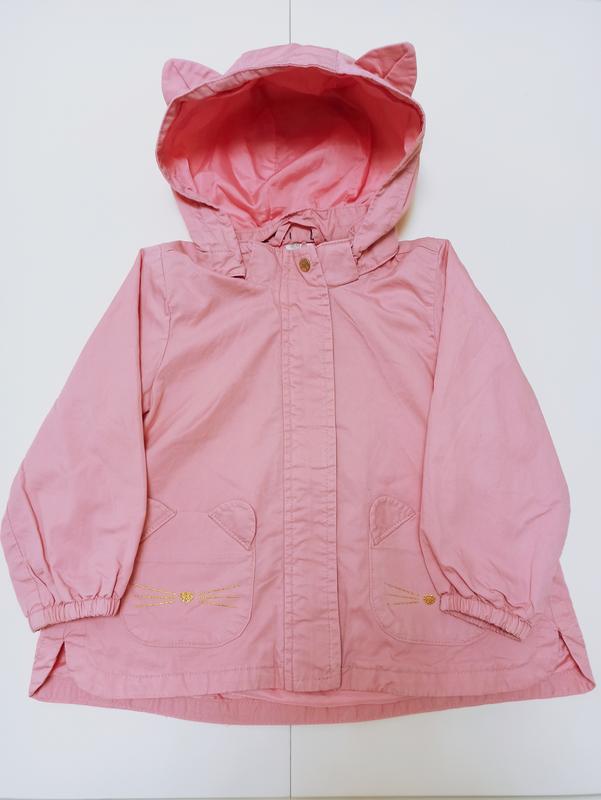 Куртка на осень. К низу расклешенная, по бокам небольшие разрезы. Замок на молнии, вверху одна кнопка и на липучках. Рукава на резинке. Капюшон съёмный, на липучках. Без утеплителя. Замеры на фото.