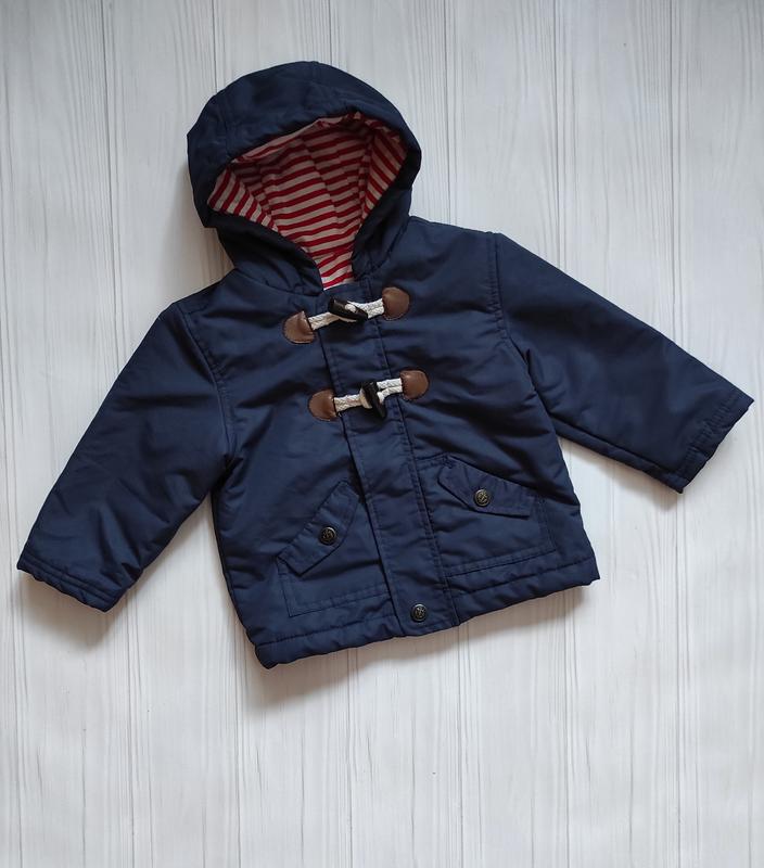 Легенькая демисезонная курточка. По бирке 9-12, но большемерит. Длина 35, ширина 31, рукав 27.