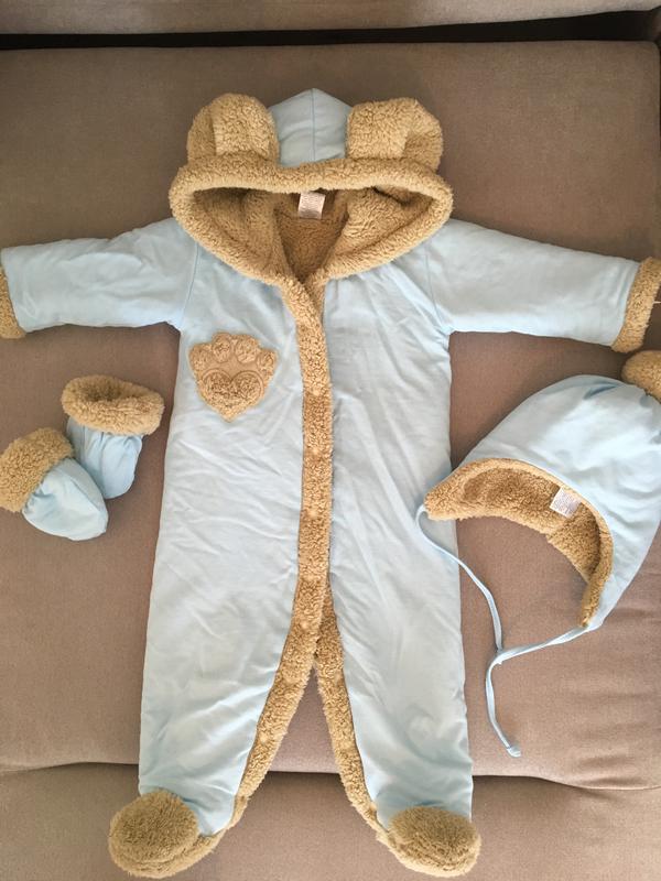 Комплект з комбінезону, рукавиць та шапки. Рукавиці і шапка в ідеальному стані, нові. Комбінезон теплий, цільний (ніжки закриті). Єдиний недолік ледве помітні плями знизу з правої сторони. Демисезонний та євро зима