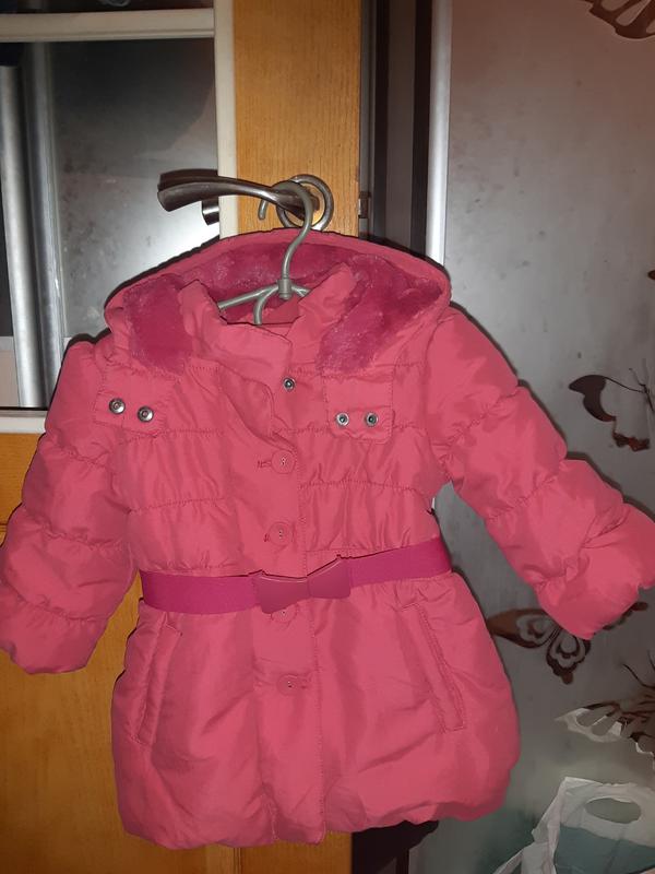 Нове пальтечко на 12-18міс. на зростання 72-86см. Жодного разу не одягали, але випране один раз. Є поясок. Довжина від плеча 44см, плечі 28см, ширина пахви 33см, рукав від плеча 28см, низ37см. Утеплювач+фліс, капюшон з хутром не отстегивювается.
