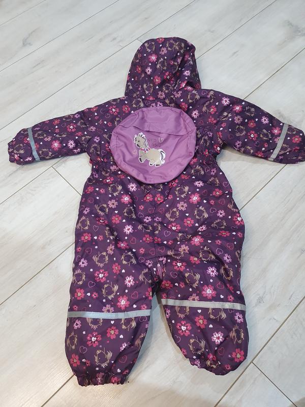 шикарный комбинезон, весна-осень. плащевка, внутри не сильно большой слой синт. Состояние новой вещи. на спинке рюкзачек действующий замер :длина всего изделия ( не учитывая капюшон ,по спинке)66см . длина рукава от плеча 27,5см,плечи 27,5. полушаг 19,5см указан рост 74см