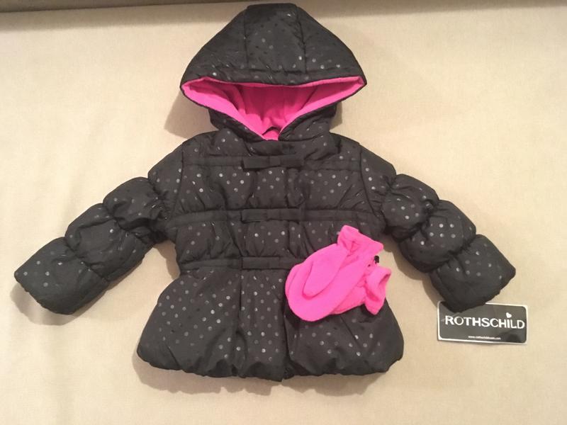 Куртка с капюшоном в комплекте с варежками для девочки от американского бренда Rothschild. Куртка изготовлена из водоотталкивающей и непродуваемой ткани, качественный экологически чистый наполнитель ― холлофайбер. Дополнительное тепло и комфорт создает теплая и мягкая подкладка из микрофлиса.размер 18 месяцев.