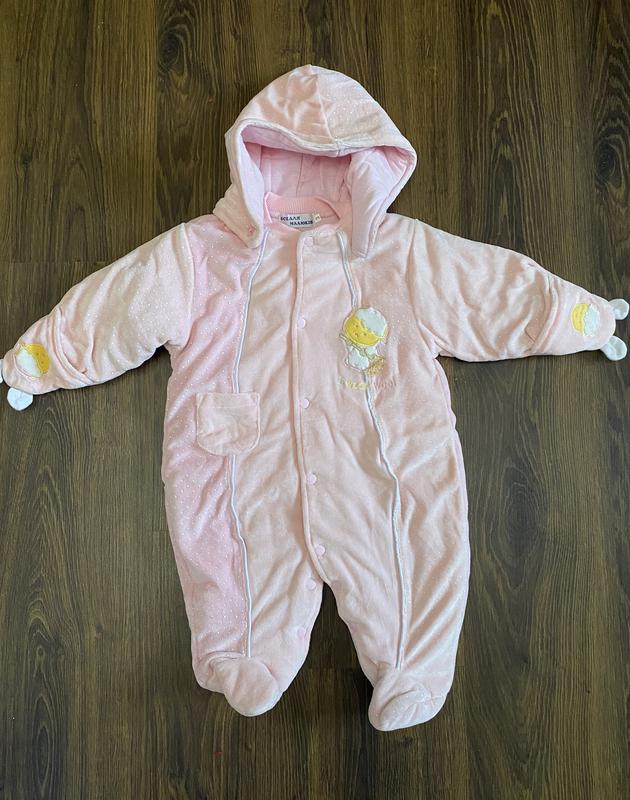 Детский комбинезон, очень мягкий и приятный на ощупь, на синтепоне, хлопковая подкладка, капюшон отстегивается Размер 74 Замеры: Д. с капюшоном 78 Д. без капюшона 62