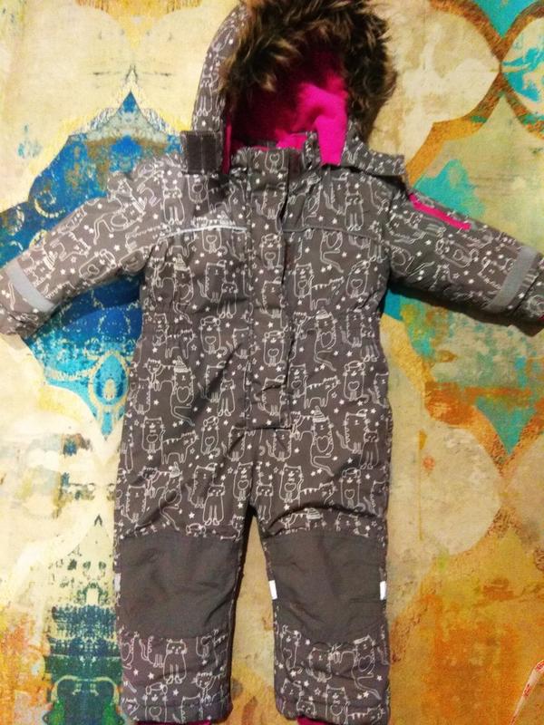 Дуже зручний і практичний, не промокає, не продуває, добре відтирається. На рукавах і ножкпх резинки Розмір 80. Заміри (ПО): плечі 30, талія 30, довжина 68 (від плеча), рукав 28.