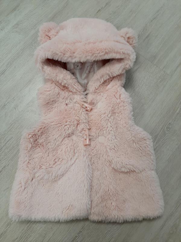Желетка для девочки. на 9- 12 месяцев. состояние идеальное. на капюшончике ушки, сзади маленький хвостик)) длинна от плеча 32 см. ПО под руками 32 см.