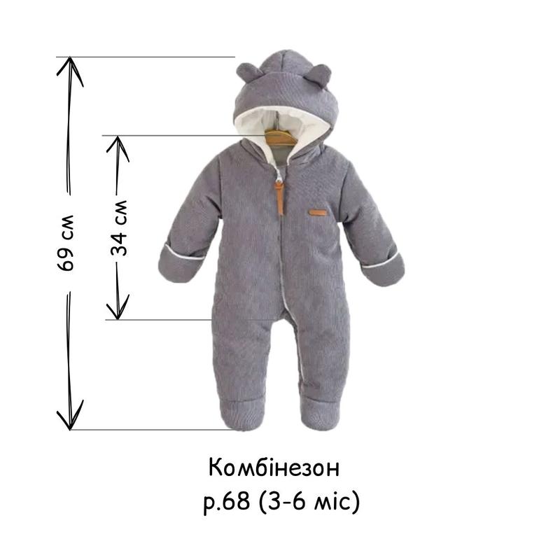 Комбинезон утеплен для младенцев. Размер 68 на 3-6 мес. Внешне - микровельвет серого цвета. Ручки закрываются. Утеплитель - силиконовый синтепон. Подкладка - 100% хлопок. Вещь совершенно новая.