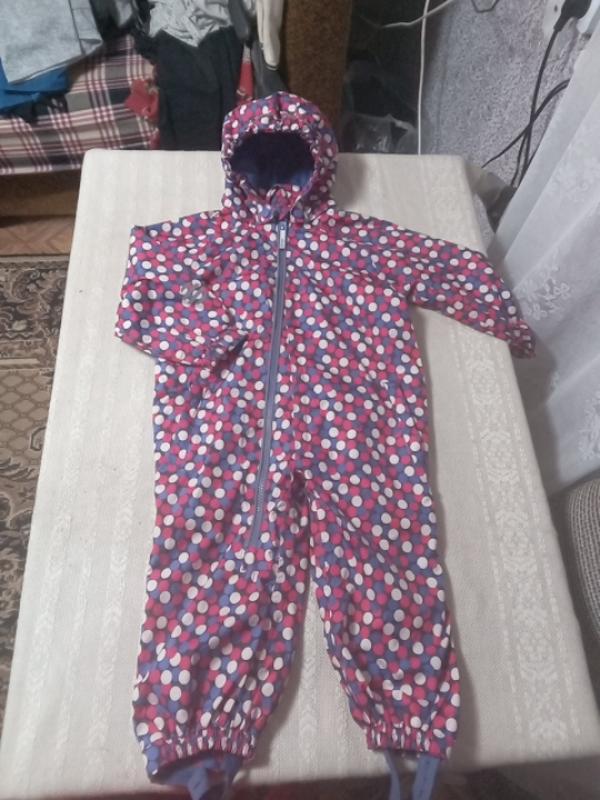 состояние идеальное,плотная качественная плащевка на подкладе, на весну-осень, яркий принт горох,карманы на молниях,капюшон, светоотражающие элементы, молния на всю длину- удобно надевать пог 35 см рукав реглан от шеи 40 см длина 75 см без учета. бретелей на ногах