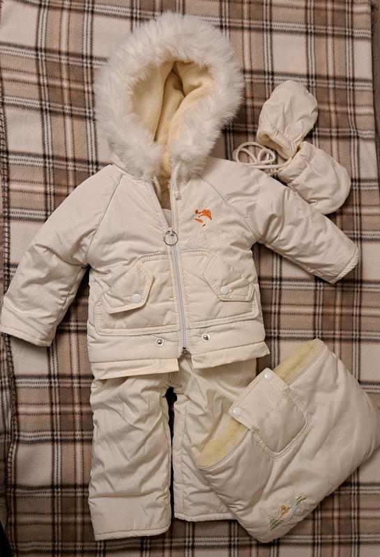 Після 1 дитини комбінезон: куртка, конверт, штанці, рукавички. Колір молочний! Куртка і конверт на овчині, штанці і рукавички на флісі. Конверт дуже зручно простібається до картки на молнію, тому навіть підійде для виписки з пологового. Комплект підійде, і новонародженому, і завдяки штанцям до місяців 9 точно буде. Параметри: Куртка з конвертом - загальна довжина 60 см, якщо міряти по спинці (без капюшон капюшона) Куртка - довжина від шиї 37 см, рукавички (під рукою) - 22 см, ширина 34 см Штани - довжина кроку 28 см, від застібки довжина 59 см. Недоліки- на куртці на собаці кріплення зламане, але закріпила кільце, на функціонал не впливає. Можливий самовивіз з лівого берега.