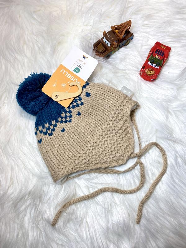 Нова. Детская вязаная шапка с помпоном и завязками "PUSBLU" р: 3-12 мес. Указан размер: 3-6 мес. (Объем: 44-45 см). Подойдет на 3-12 месяцев. Вязаная шапка с помпоном и завязками, подходит для холодной погоды. Внутри утеплена флисом. Дизайн: Бежевый цвет с синим узором и синим помпоном. Имеет завязки для надежной фиксации. Ответим на увлекательные вопросы. ❗️❗️❗️В наличии.