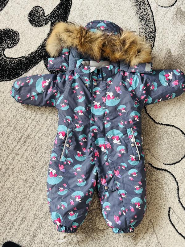 Дуже теплий,в середині на флісі, є фіксатори на ніжках, штріпки силіконові і вони знімаються, хутро натуральне на капюшоні (відстібається),верх тканина мембрана не промокає і не продуває, наповнювач тінсулейт. Температурний режим -30. Стан нового.Розмір 74,але буде довше(заміри на фото).