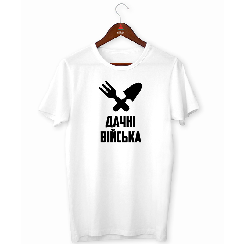 Футболка з оригінальним принтом для дачників "дачні війська. схрещені лопатка і граблі" pu...