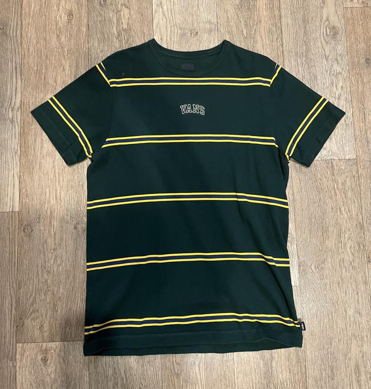 Vans T-shirt Original Темно-зелена футболка Vans з жовтими та синіми смугами. Класичний крій, приємна до тіла бавовна, оригінальний напис VANS спереду. Розмір M, стан відмінний — без плям, дірок і втрати кольору. Виробництво — Індія. Ідеальна для повсякденного стилю або скейт-культури.