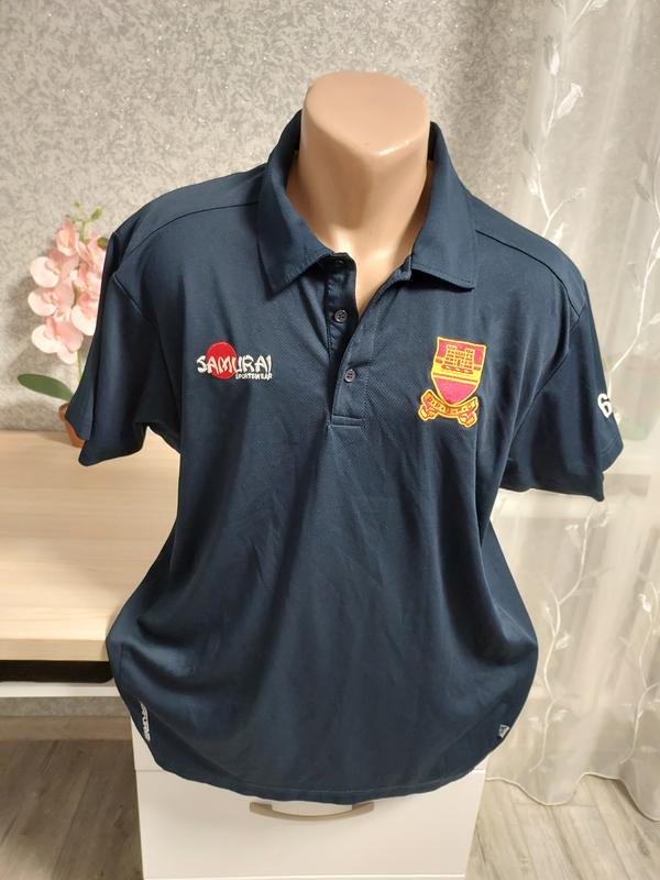Мужское поло, темно синего цвета, спортивного японского бренда Samurai, из полиэстра и эластана, размером L. В идеальном состоянии, красиво тянется, качество отлично. Все замеры на фото.