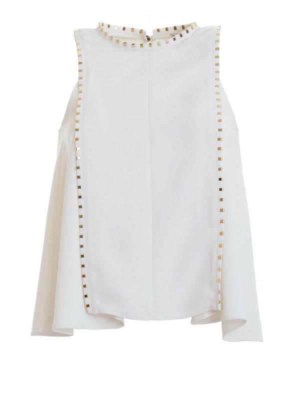 Продам молочну блузку без рукавів із декоративною золотою тасьмою. Лаконічна, елегантна модель, гарно сідає по фігурі, має подовжену спинку та плавну лінію низу. Підходить як для класичного стилю, так і для більш вишуканих образів.Стан : майже нова, була одягнена лише один раз. Є одна дуже дрібна плямка, навіть на фото не видно, у живу ледь помітна. На загальний вигляд не впливає.