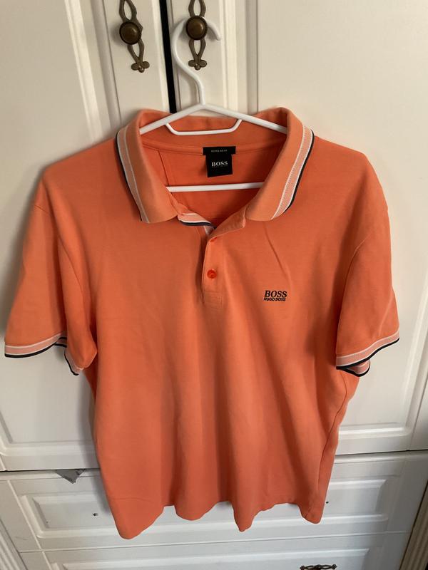 Стильное брендовe поло Hugo Boss Paddy (Regular Fit) в ярком оранжевом цвете с контрастными полосками на вороте и рукавах. Размер: XL (Regular Fit). Состав: высококачественный хлопок (приемный к телу, хорошо дышит). Цвет: ярко-оранжевый с бело-синей отделкой. Состояние: очень хорошее, без дефектов. Универсальное поло для повседневных образов, отдыха или смарт-кежуал стиля. Легко комбинируется с джинсами, шортами или классическими брюками.