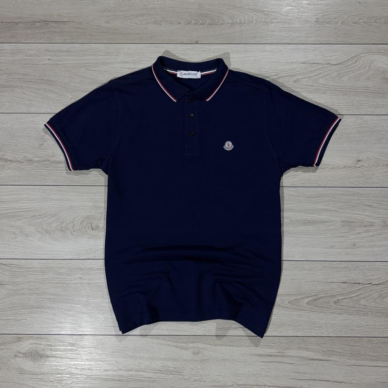 Новая темно синяя поло монклер moncler dark blue с триколором, размер l