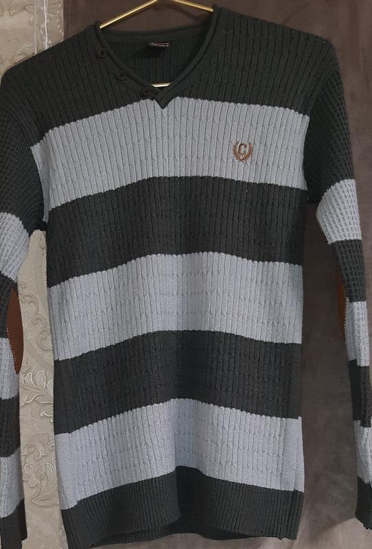 Джемпер мужской в серо -зеленую полоску, турецкого производства, размер М. Длина изделия 65 см, длина рукава 58см, обхват по гуде 83см.