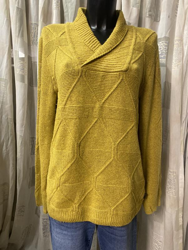 Стильный теплый качественный джемпер от Hugo Boss. Красивый горчичный цвет. Состав: шерсть / шовк / антора / полиамид (50 / 15 / 5 / 30). Размер по набору-М. Замеры:длина-70 см, ПОГ-50 см, ПОБ-48 см, рукав-65 см, ширина по плечам-43 см.