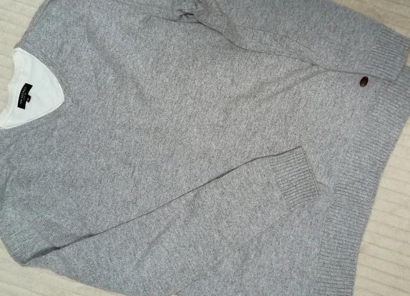 Серый пуловер известного бренда. Бирка со составом срезана, да там точно есть много хлопка и немножко шерсти. Пуловер приятный к телу, мягкий и нежный. Серый цвет будет красиво сочетаться как с джинсами, так и с классическими брюками разных цветов. Состояние очень хорошее. Замеры: Пог - 54 см Плечи - 44 см Рукав - 65 см Длиж - 67 см