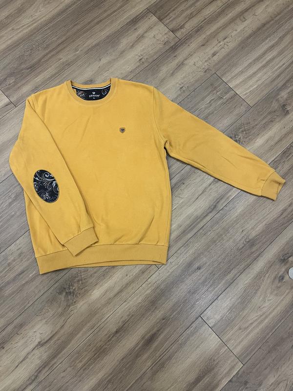Охра цвет, мягкий. С интересными вставками на локтях.